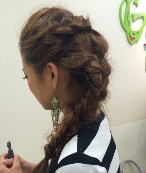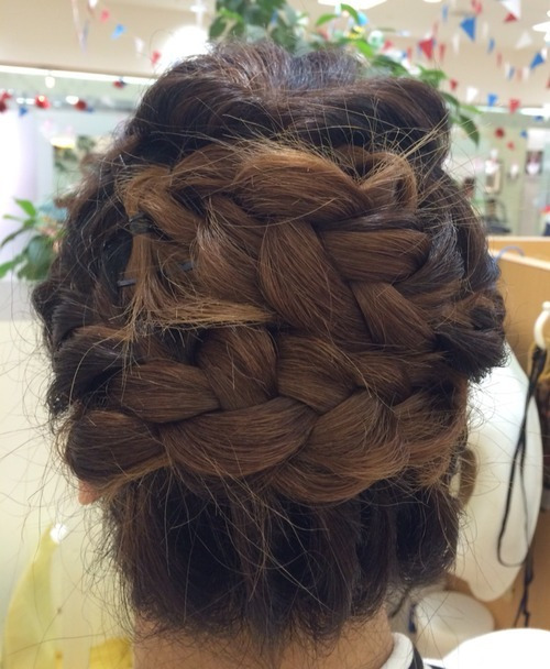 ロングの髪を編み込みしてまとめて、