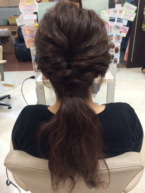 トップの毛でくるりんぱをつくって横の毛はねじって持ってきてピンで止めます。ちょっと大人なアレンジですちょっとルーズに仕上げるのがポイントですみなさんもやってみてくださいね