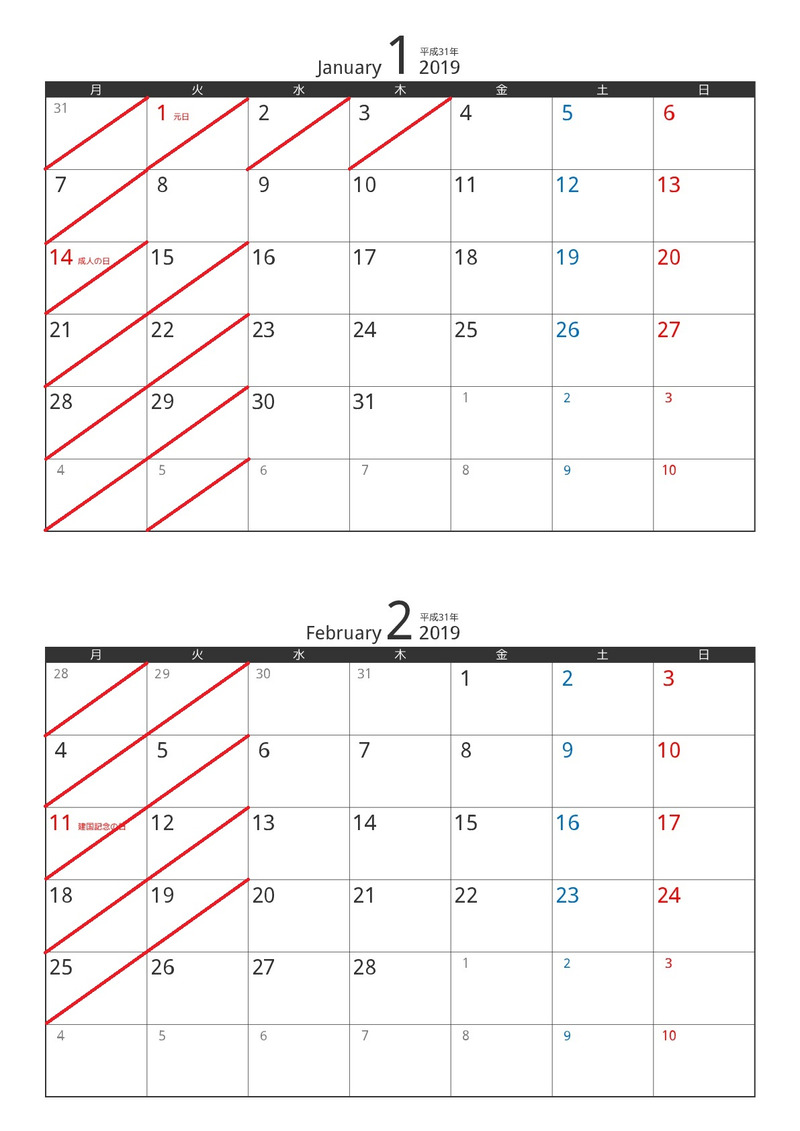 2019年1月、2月茨木店のお店の休みです。
