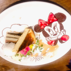 こんにちは 茨木店の 阪本です 先日お休みの日にお友達の誕生日をお祝いしました〜 お店の方におねがいして、バースデープレートに可愛いミニーちゃん描いていただきました ……