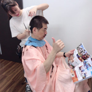 こんにちは ギャザー茨木店です✨ しょうちゃんこと中小路実優がオーナーのカット カメラを向けると オーナーがいつものポーズ このポーズ10年以上続いてます笑……